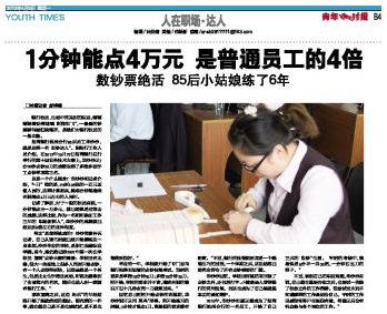 日前,《青年时报》、《新浪网》等媒体分别以“1分钟能点4万元,是普通员工的4倍”、“数钞票绝活 85后小姑娘练了6年”为主题专题报道了公司07届招商银行订单班员工华沙沙在点钞职业技能方面取得优异成绩,这是继太阳成城集团tyc234cc官网毕业生在邮政系统技能竞赛中获得优异成绩后,又为优质金融银领人才订单人才培养增添了隆重的一笔。