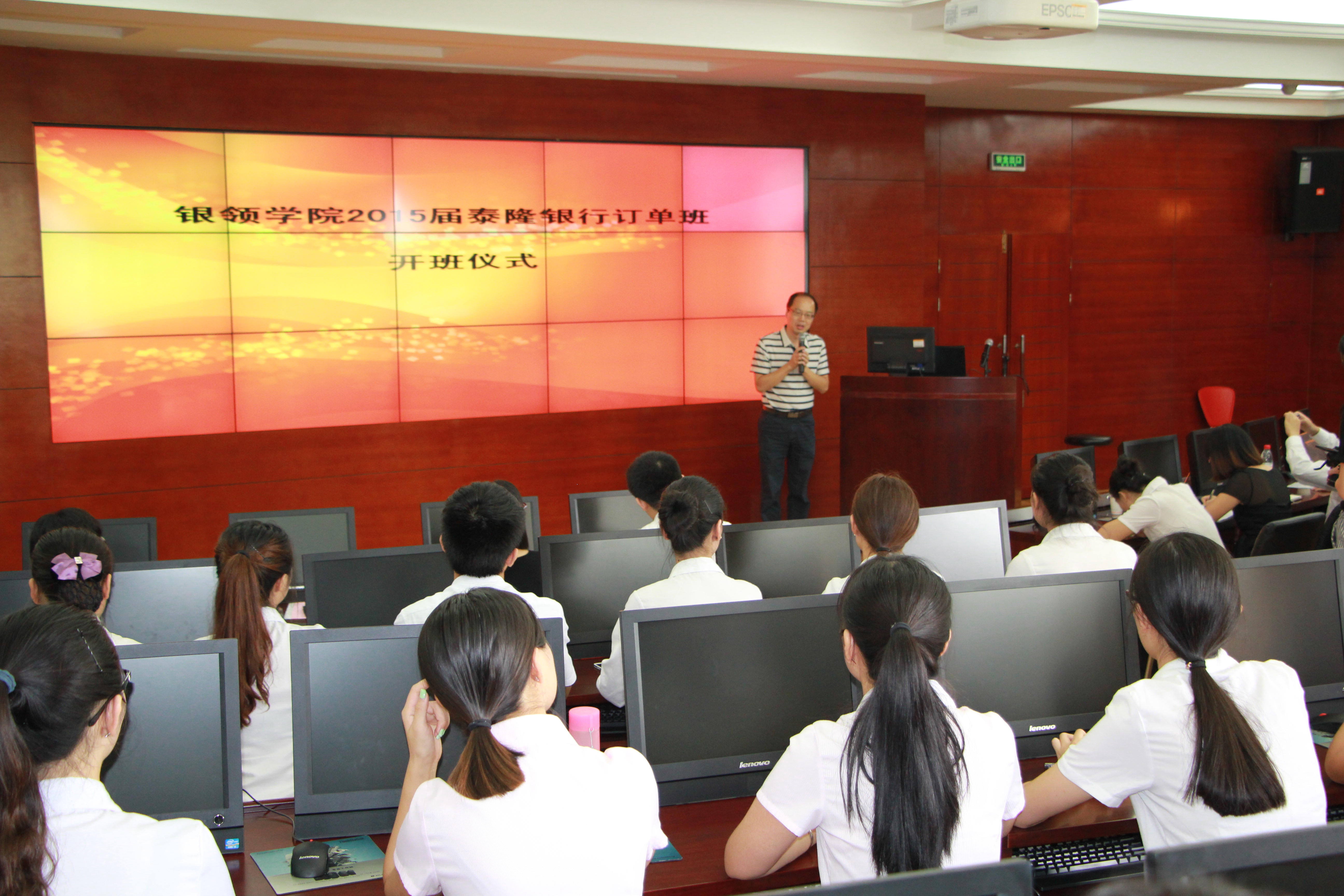 2014年9月17日,太阳成城集团tyc234cc官网2015届浙江泰隆商业银行订单班开班仪式在光大教学楼9205举行,银领公司党总支书记、副经理王祝华,浙江泰隆商业银行人力资源部员工配置中心主任郑玲,泰隆公司教务中心主任沈莹,杭州城东支行业务二部总经理、2011届泰隆银行订单班毕业生薛良良,人力资源部拓聘经理顾巍伟和太阳成城集团tyc234cc官网2015届泰隆订单班全体同学出席了开班仪式,仪式由班主任蒋含真主持。