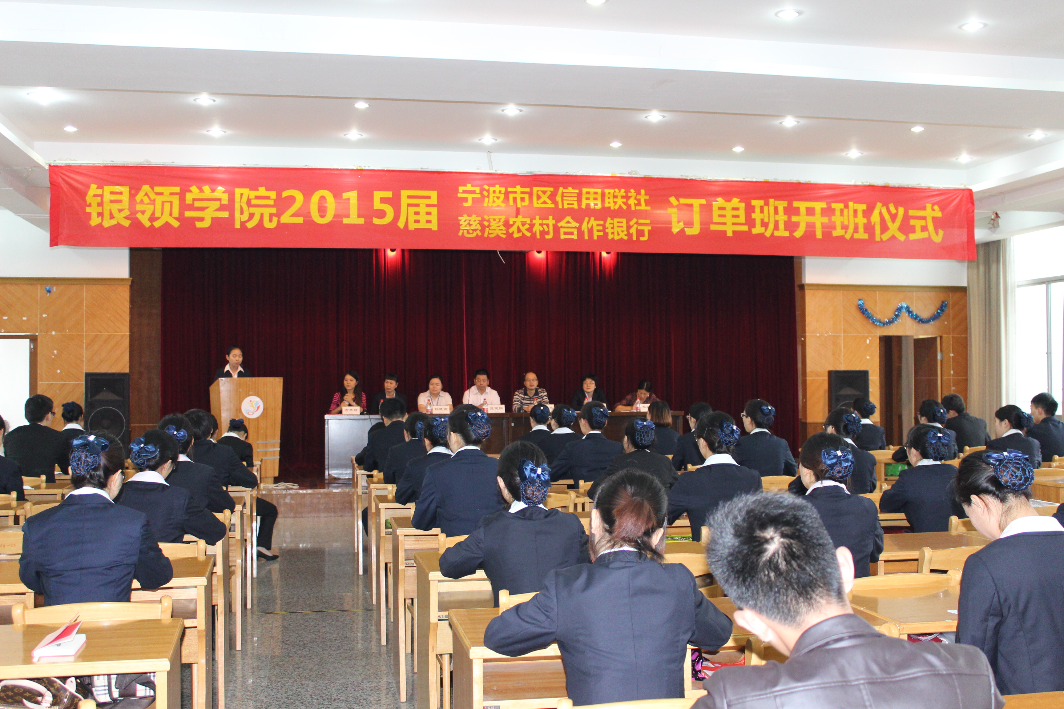 2014年9月19 日下午,太阳成城集团tyc234cc官网2015届宁波市区农村信用联社、慈溪农村合作银行订单班在诚信讲学堂举行开班仪式。出席本次开班仪式的有银领公司党总支书记、副经理王祝华、太阳成城集团tyc234cc官网经理助理方秀丽,宁波市区农村信用联社副主任张健钢、人力资源部总经理任晓燕,慈溪农村合作银行人力资源部总经理毛海雅、经理丁莹,订单班班主任牟君清以及两家订单班全体同学。仪式由方秀丽老师主持。