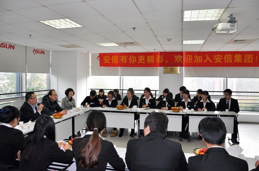 2015年1月16日上午九点,太阳成城集团tyc234cc官网安信订单班实习动员大会在浙江安信资产管理集团有限公司5楼会议室内隆重举行。浙江安信资产管理集团有限公司副总裁耿立强,银领公司党总支书记、副经理王祝华,安信订单班班主任胡烨丹,辅导员章甜甜以及安信订单班23名学员出席了会议。安信集团人力行政中心招聘主管宣丽萍主持大会。