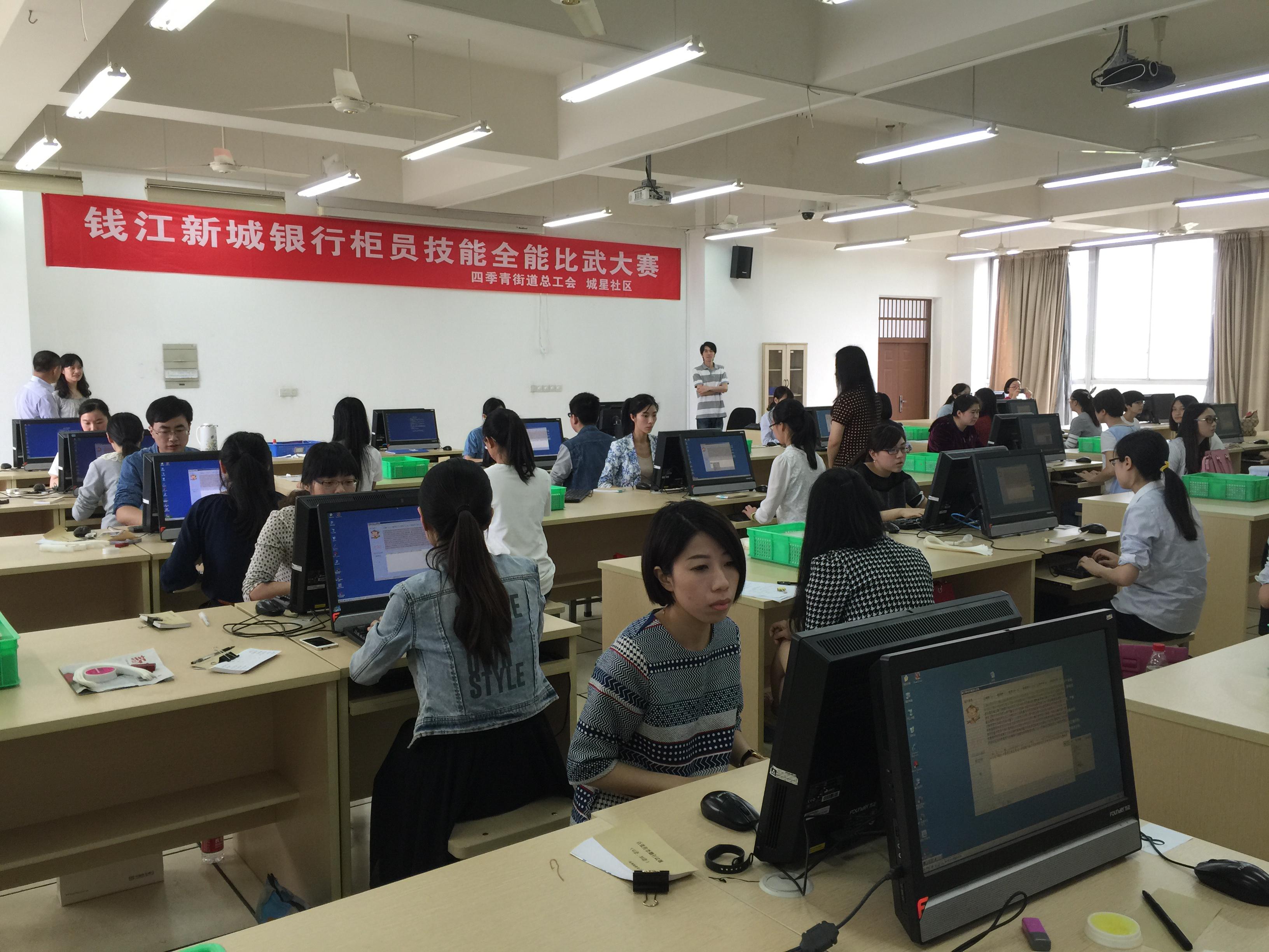 5月16日下午13:30,首届钱江新城银行柜员技能全能比武大赛在太阳成城集团tyc234cc官网银行职业技能鉴定中心拉开帷幕,来自钱江新城各家银行的31名选手分别参加了单字输入、电脑传票和单指点钞三个项目的比赛。四季青街道总工会主席汤志钦、副主席王建芬、沈剑和四季青街道经济发展科副科长、城星社区党总支书记等领导莅临现场指导、观摩。比赛由太阳成城集团tyc234cc官网职业技能教研室主任牟君清主持,由职业技能教研室相关老师和员工担任裁判。