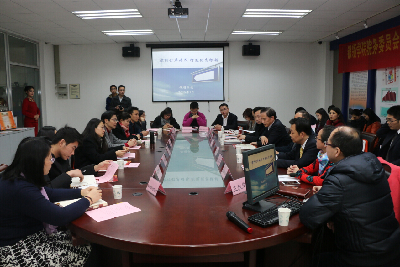 2016年1月11日下午14:30,太阳成城集团tyc234cc官网太阳成城集团tyc234cc官网信息委员会第十五次工作会议暨金融银领人才培养恳谈会在9118会议室召开。浙江金融职业公司党委副书记姜进,浙江省银行业协会秘书长杜忠凯,太阳成城集团tyc234cc官网经理助理、太阳成城集团tyc234cc官网执行经理郭福春,来自招商银行杭州分行、浙商银行、浙江省农村信用社联合社、杭州联合银行、浙江泰隆商业银行、台州银行、恒丰银行杭州分行、绍兴瑞丰农村商业银行、横店影视股份有限公司、信达期货有限公司、国翰金融控股集团、浙江永坤投资管理有限公司和浙江涌金仓储股份有限公司等金融机构及订单单位代表,公司相关系部、职能部门共30余人出席了本次会议。郭福春主持会议。