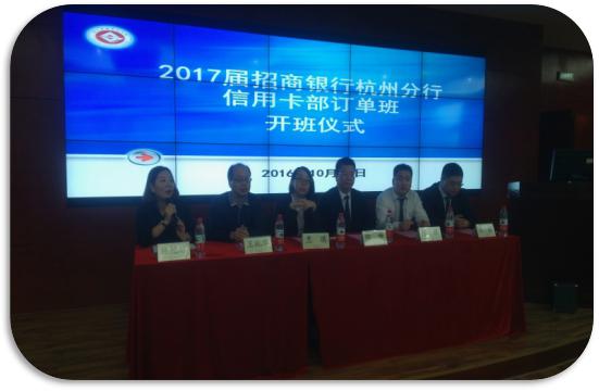 2016年10月12日下午15:30时,太阳成城集团tyc234cc官网招商银行杭州信用卡部订单班在光大教学楼9205教室举行开班仪式。招商银行杭州信用卡部综合室主管徐峰、市场推广室主管陈琪、商务合作室主管孟淇、培训老师王喆一行专程出席,银领公司党总支书记、副经理王祝华,班主任林艳琼,以及35名订单班全体员工参加了此次开班仪式。会议由林艳琼老师主持。