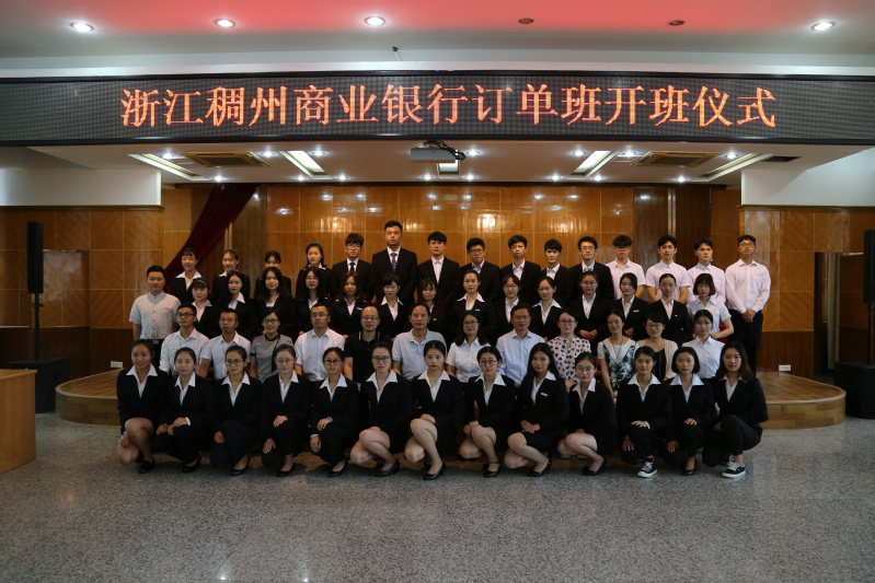 2017年9月20日下午,首届浙江稠州商业银行订单班开班暨浙江稠州商业银行订单人才培养基地揭牌仪式在诚信讲学堂隆重举行。浙江稠州商业银行人力资源部总经理金雁、培训管理中心主任王梓旭、订单班行业班主任江曾,浙江金融职业公司党委副书记姜进,银领公司党总支书记、副经理王祝华,银领公司党总支副书记、副经理王东升,订单班校方班主任章叶英及全体浙江稠州商业银行订单班同学共同参加。仪式由王东升主持。