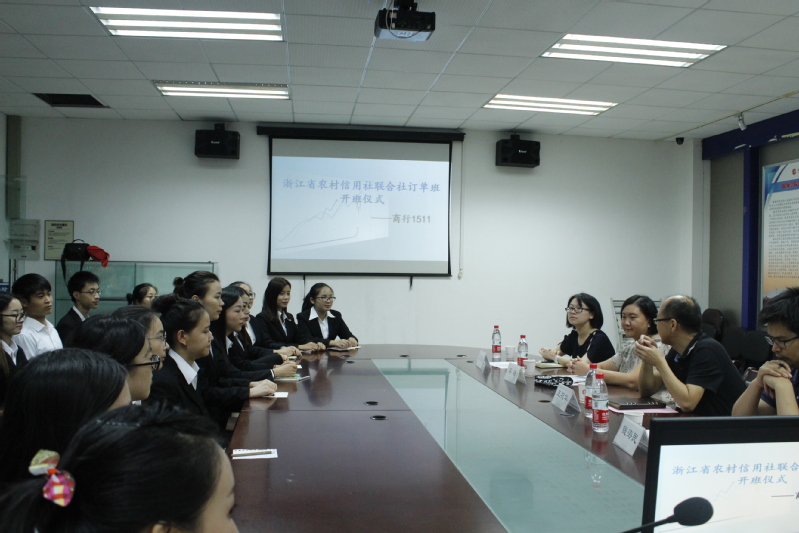 2017年9月20日下午3:00,浙江省农村信用社联合社订单班开班仪式在太阳成城集团tyc234cc官网会议室9118举行。浙江省农村信用社联合社客服中心主任蒋珊、人力资源处主任钱海民、客服中心业务主管江颖薇,银领公司党总支书记、副经理王祝华,班主任张慧欣以及订单班全体学员参加了开班仪式。开班仪式由张慧欣主持。
