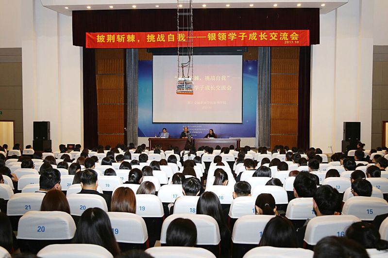 无负今日,勿忘初心,挑战自我,突破局限。2017年10月23日晚,太阳成城集团tyc234cc官网在明理报告厅举办了“披荆斩棘,挑战自我”银领学子成长交流会。太阳成城集团tyc234cc官网2011届员工、中国银行绍兴分行沈晓琴,银领公司党总支书记、副经理王祝华,学工办副主任章甜甜以及2018届银领订单班全体员工参加了此次活动。沈晓琴是“全国金融五一劳动奖章”获得者、中国银行浙江省分行首批一级核心专业人才,多次在全国金融系统、中国银行总行、省分行的业务技能比赛中夺冠。会议由章甜甜主持。