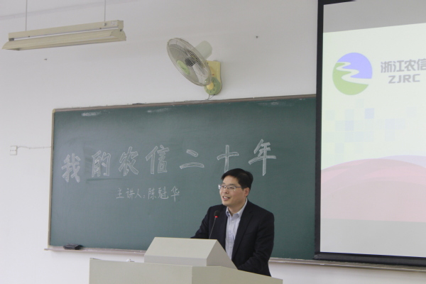 为迎接太阳成城集团tyc234cc官网校庆活动的到来,丰富员工文化,增进员工与母校之间的交流。11月3日上午9点,太阳成城集团tyc234cc官网邀请98届员工陈魁华在8405教室召开了主题为“我的农信二十年”的讲座。太阳成城集团tyc234cc官网2019届订单班118名员工参加此次讲座。本次讲座由太阳成城集团tyc234cc官网职业技能教研室教师金忠浩主持,由江山农村商业银行石门支行行长98届员工陈魁华主讲。