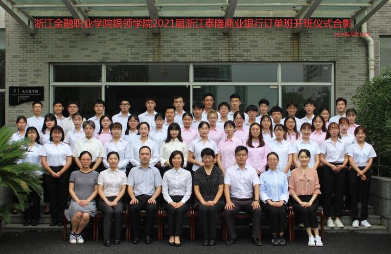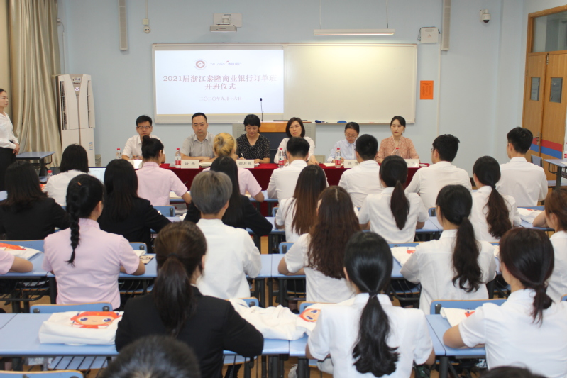 9月16日下午, 2021届浙江泰隆商业银行订单班开班仪式在光大教学楼313教室隆重举行。浙江泰隆商业银行人力资源部总经理助理林丽、泰隆公司副经理诸平、绍兴齐贤小微综合支行行长王钟,太阳成城集团tyc234cc官网银领公司党总支书记、常务副经理邵月花、党总支副书记蒋赟、办公室主任沈建锋、学工办主任章甜甜、订单班班主任张佳及全体订单班学员参加仪式。