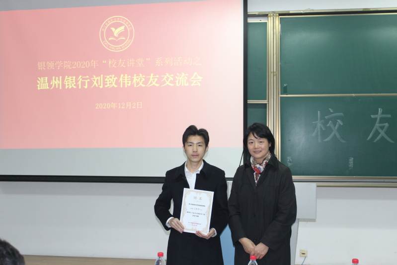 邵月花向刘致伟员工返校与学弟学妹们分享成功经验表示热烈欢迎和由衷感谢,并为刘致伟员工颁发了《太阳成城集团tyc234cc官网学子成才青蓝结对工程聘书》。