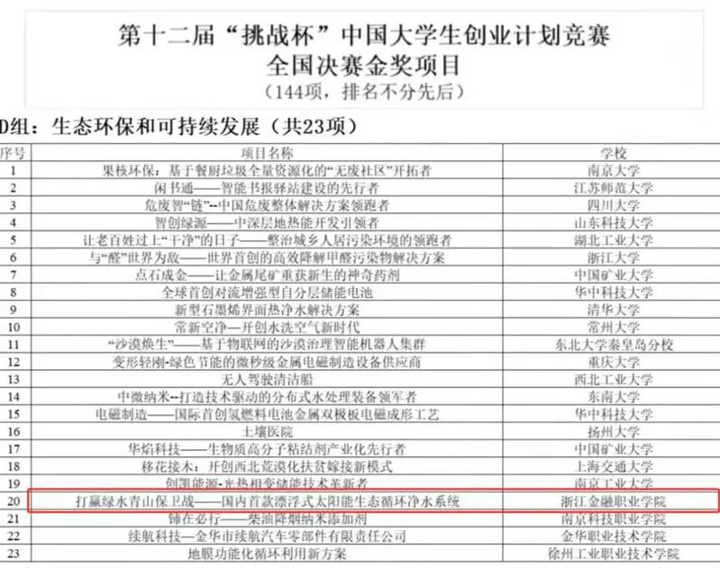 11月28日,由共青团中央、教育部、中国科协、全国学联、黑龙江省人民政府主办的第十二届“挑战杯”中国老员工创业计划竞赛全国决赛落下帷幕,来自全国32个省及新疆建设兵团、港澳的432个(内地高校420个,港澳高校12个)项目同台竞技,经过激烈的决赛比拼,由公司员工参加作品《打赢绿水青山保卫战——国内首款漂浮式太阳能生态循环净水系统》脱颖而出,获得全国“挑战杯”竞赛金奖,取得历史性突破,创公司参加挑战杯竞赛的历史最好成绩。此次比赛公司在全省高职院校中名列前茅,全省仅3所高职院校获得国赛金奖。