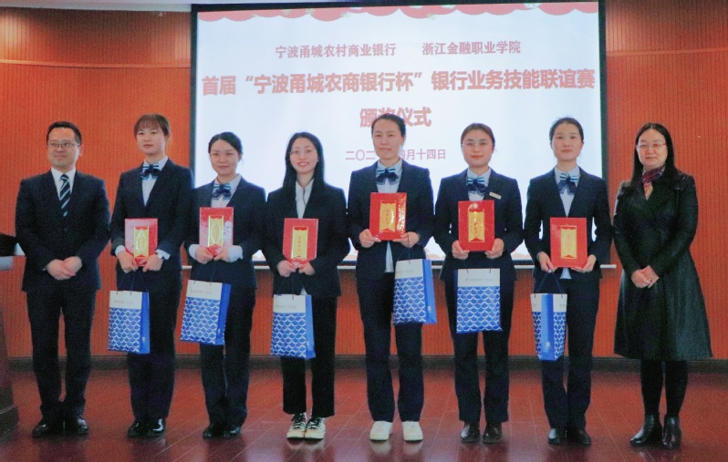 颁奖仪式前,双方选手经过在各赛项中的激烈角逐,公司农商18(2)班李娜、甬城农商行陈瑶、胡珍珍分别在单字输入、传票输入、单指单张点钞赛项中荣获一等奖;甬城农商行金可超、徐丹霞、董柯缨、农商18(2)班李娜、甬城农商行朱蒙佳、陈瑜分别在单字输入、传票输入、单指单张点钞赛项中荣获二等奖;甬城农商行陈秋红、徐秦佳、张璐、徐丹倩、公司会计19(9)班陈文欣、金融20(10)班陈邹萍、姚佳奇、俞益施、农商18(3)班严佳成分别在单字输入、传票输入、单指单张点钞赛项中荣获三等奖。