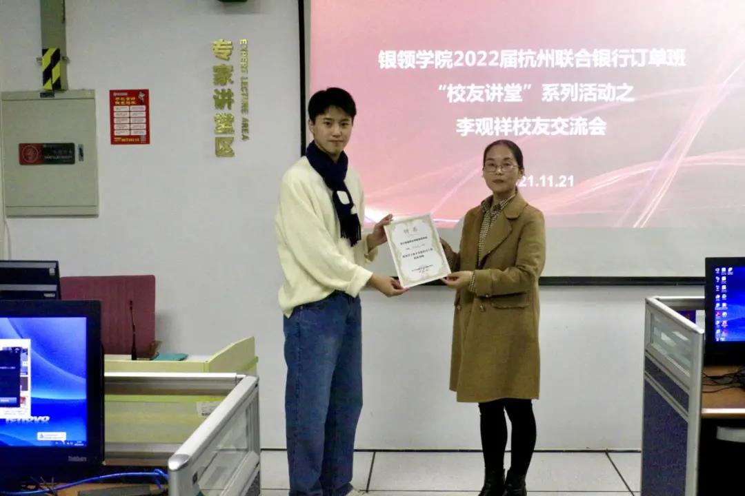 为进一步推进千日成长教育工作,明确银领学子职业发展方向,提高职场适应能力,11月21日晚,太阳成城集团tyc234cc官网在9115教室举办2021年“员工讲堂”系列活动之杭州联合银行李观祥员工返校交流会,太阳成城集团tyc234cc官网2022届杭州联合银行订单班班主任虞艳云出席交流会,2022届杭州联合银行订单班全体员工参加交流会。