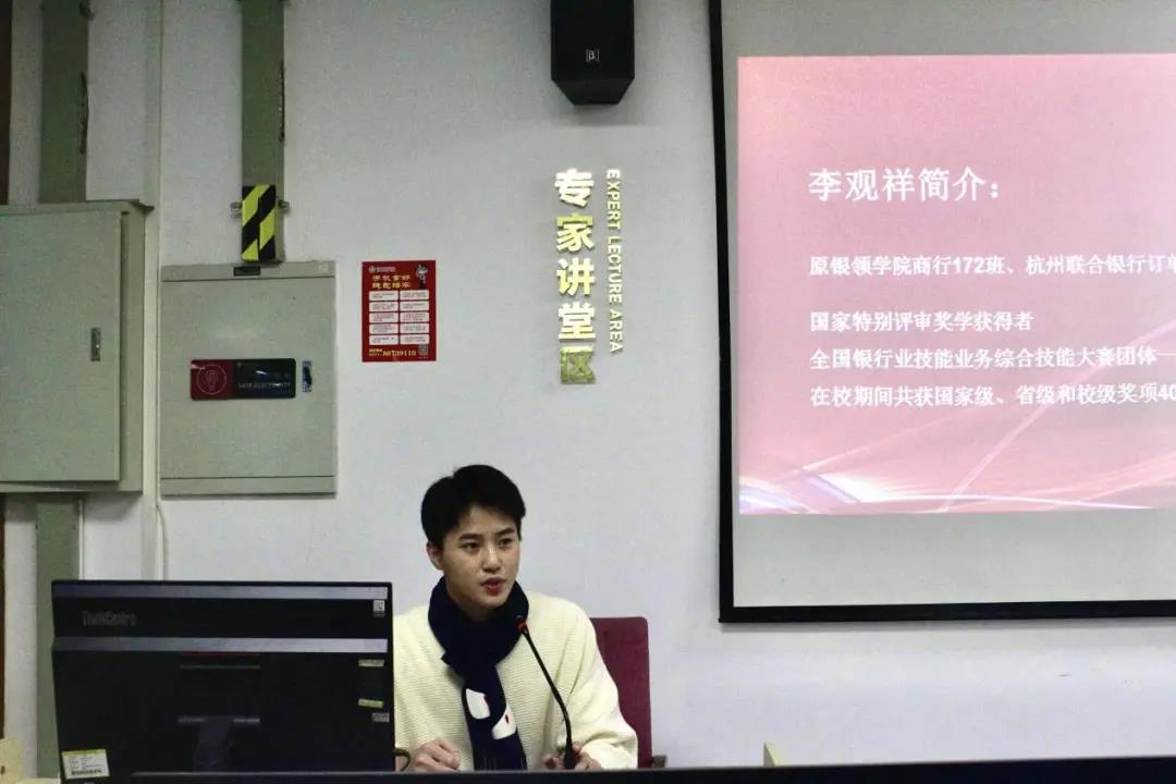 李观祥员工表达了对母校的感恩、对太阳成城集团tyc234cc官网的感谢。他结合自身经历,从四个方面向杭州联合银行订单班的学员们分享了职场经验及心得,并给出了四点中肯的建议。一是明确技能的重要性,拥有好的技能将成为一大竞争优势,达到行业标准是第一步,在此基础之上还要做得更好。二是在校期间应多多考取证书,认真对待行里的考试,争取高分通过。三是要重视在不同岗位上得到的历练,寻找自己身上的亮点,提高营销本领。四是在上柜时要多听多看多问,遇到不懂的业务要大胆提问。