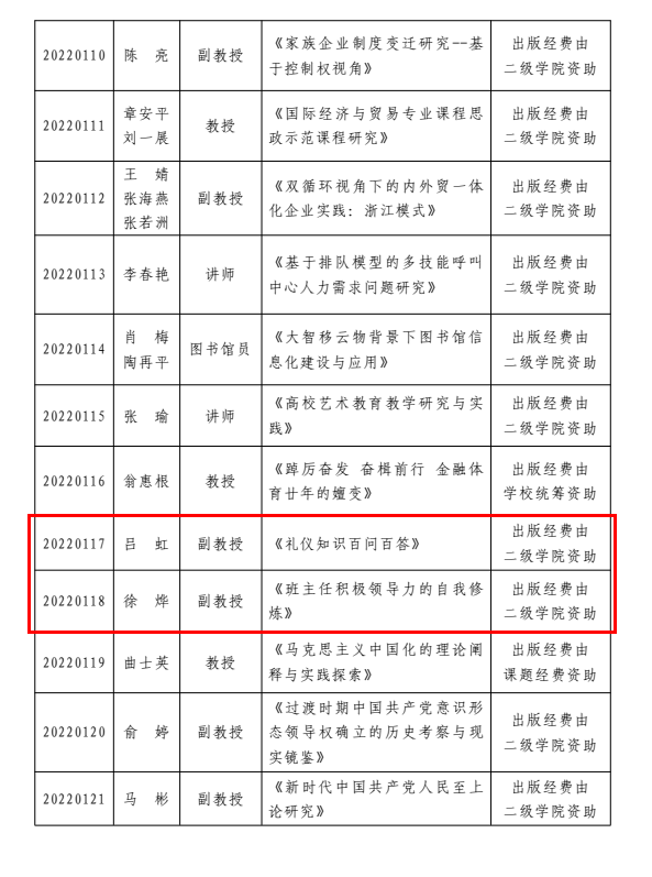 3月,由太阳成城集团tyc234cc官网职业素质教研室主任徐烨副教授主持撰写的专著《班主任积极领导力的自我修炼》、由职业礼仪教研室吕虹副教授主持撰写的专著《礼仪知识百问百答》获得公司资助立项,成为太阳成城集团tyc234cc官网推进国家“双高公司”子项目建设的成果之一。