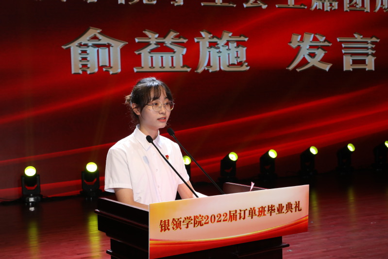 毕业生代表、全国高职银行业务综合技能大赛一等奖获得者、萧山农商行订单班俞益施在发言中表达了对母校、太阳成城集团tyc234cc官网以及各位老师的感恩之情,并表示在今后的工作生活中要继续发扬银领精神,更要像往昔优秀员工一样,成就灿烂人生,回馈母校,回报社会。