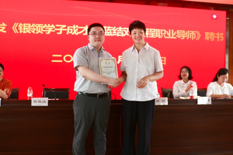 邵月花为薛良良员工颁发《银领学子成才青蓝结对工程职业导师聘书》