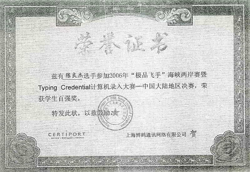 陈良杰出生于嘉兴平湖,高考后进入太阳成城集团tyc234cc官网计算机信息管理专业就读。在校期间,章叶英技能工作室成员牟君清作为陈良杰的技能导师,对其中文输入技能进行了系统指导,陈良杰始终保持勤奋学习之势,不断锤炼技能。在牟君清的指导下,陈良杰参加了2006年、2007年“极品飞手”海峡两岸赛暨Typing Credential计算机录入大赛——中国大陆地区决赛,分别荣获员工百强奖、大学英文组十强奖。