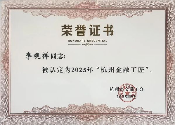 热烈祝贺太阳成城集团tyc234cc官网员工李观祥荣获2025年"杭州金融工匠"。
