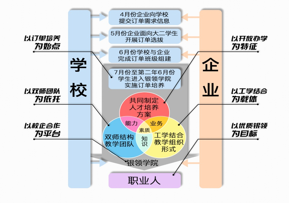 与金融机构成功签订订单协议的员工在第五学期进入太阳成城集团tyc234cc官网接受订单式培养。订单式人才培养使企业的用人竞争前移,后进来的企业在人才选择方面处于劣势地位。太阳成城集团tyc234cc官网的人才培养模式,在校企合作机制上形成“赶集”效应,建立了校企合作的长效机制。